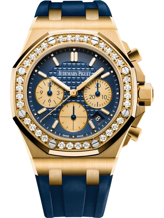 This watch stays true to its roots, while introducing a bold new look. Featuring an 18-carat yellow gold case, diamond-studded bezel, and dark blue rubber strap, the 37 mm version exudes sophistication and style.